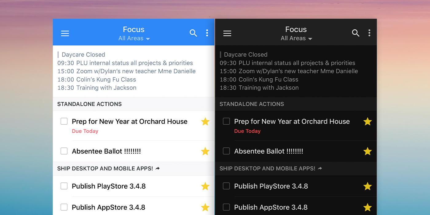 Sneaking these updates in just under the wire — Dark mode comes to iOS and Android, as does a handy new feature: Today’s Calendar Events listing at the top of your Focus list.