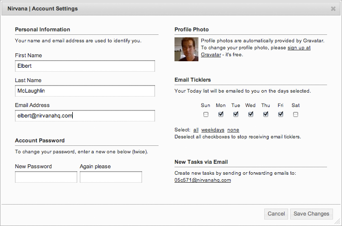 Email Ticklers: Select the days you’d like Nirvana to send you an email with your daily todo list