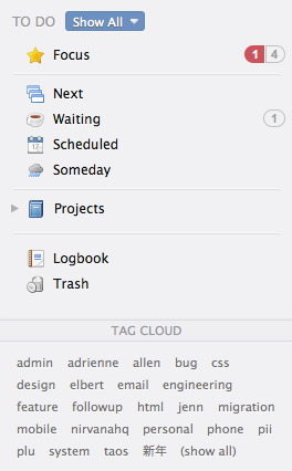 Biggest new feature is the Tag Cloud. Want to see everything tagged across your entire account or selected area? The Tag Cloud is your new best friend. It works similar to any other GTD state list (inbox/next/someday) in that you click in the left navi, and tasks appear to the right. From there you can drill down via the context filtering bar at the top.