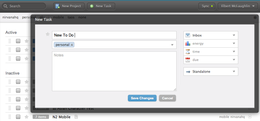 A nice UI improvement that came out of this is that new tasks and projects can now be created via a popup dialog, rather than inline if you so choose. Use the hot key ‘t’ to create a new task, ‘p’ to create a new project. The old hot key ’n’ has a bit more magic behind it now… new tasks and projects are created inline where it makes sense, but a popup dialog is used in places where it doesn’t (such as in search results or tag cloud selection).